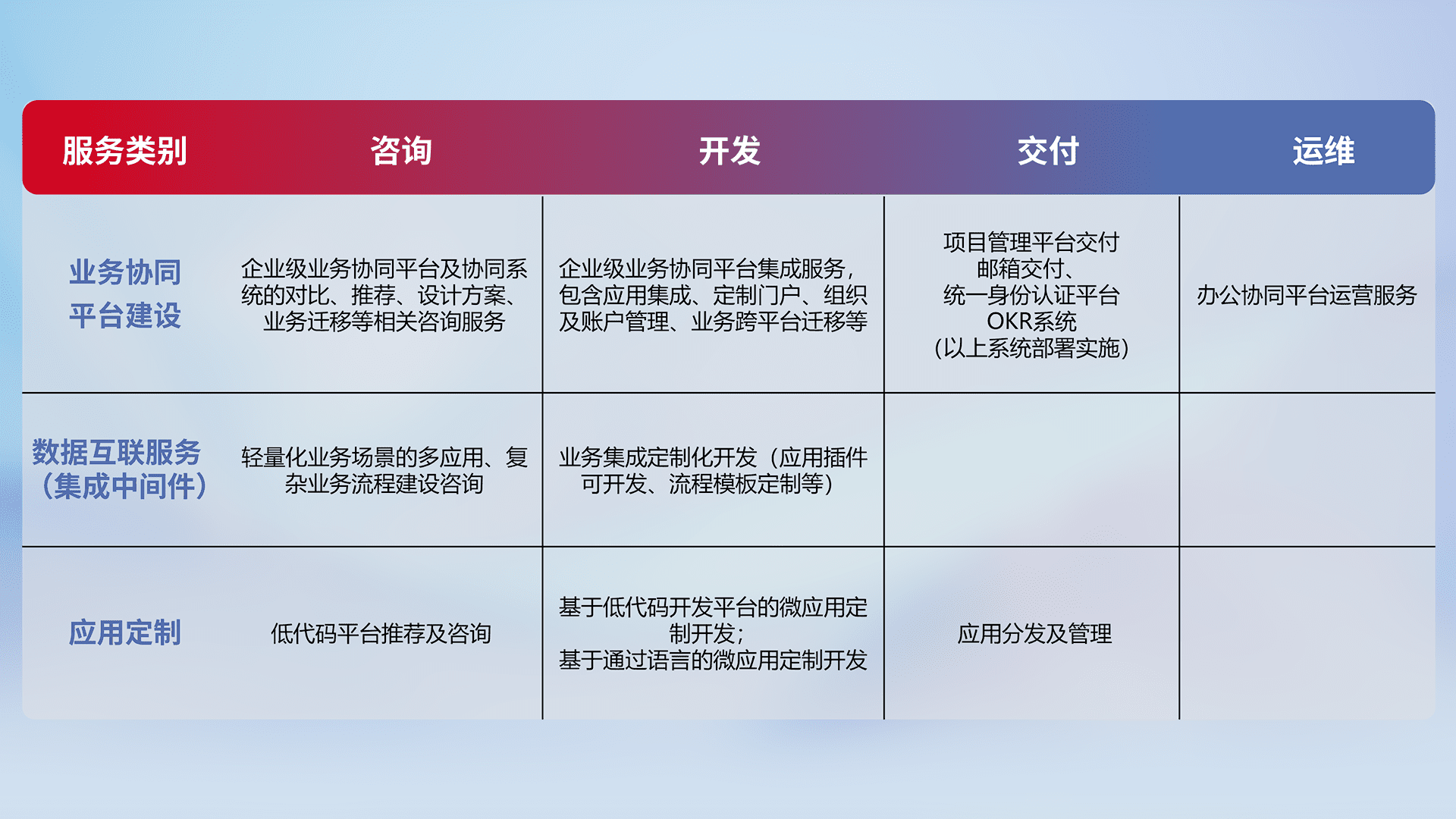 针对钉钉、、、、企微、、IDaas等平台级产品提供产品的规划、、、方案、、、交付、、、、定制化开发等服务,,实现如统一协同办公、、智能客户服务、、、、混合会议管理、、智能数据查询、、、等业务场景,,,实现数字化转型。。。。