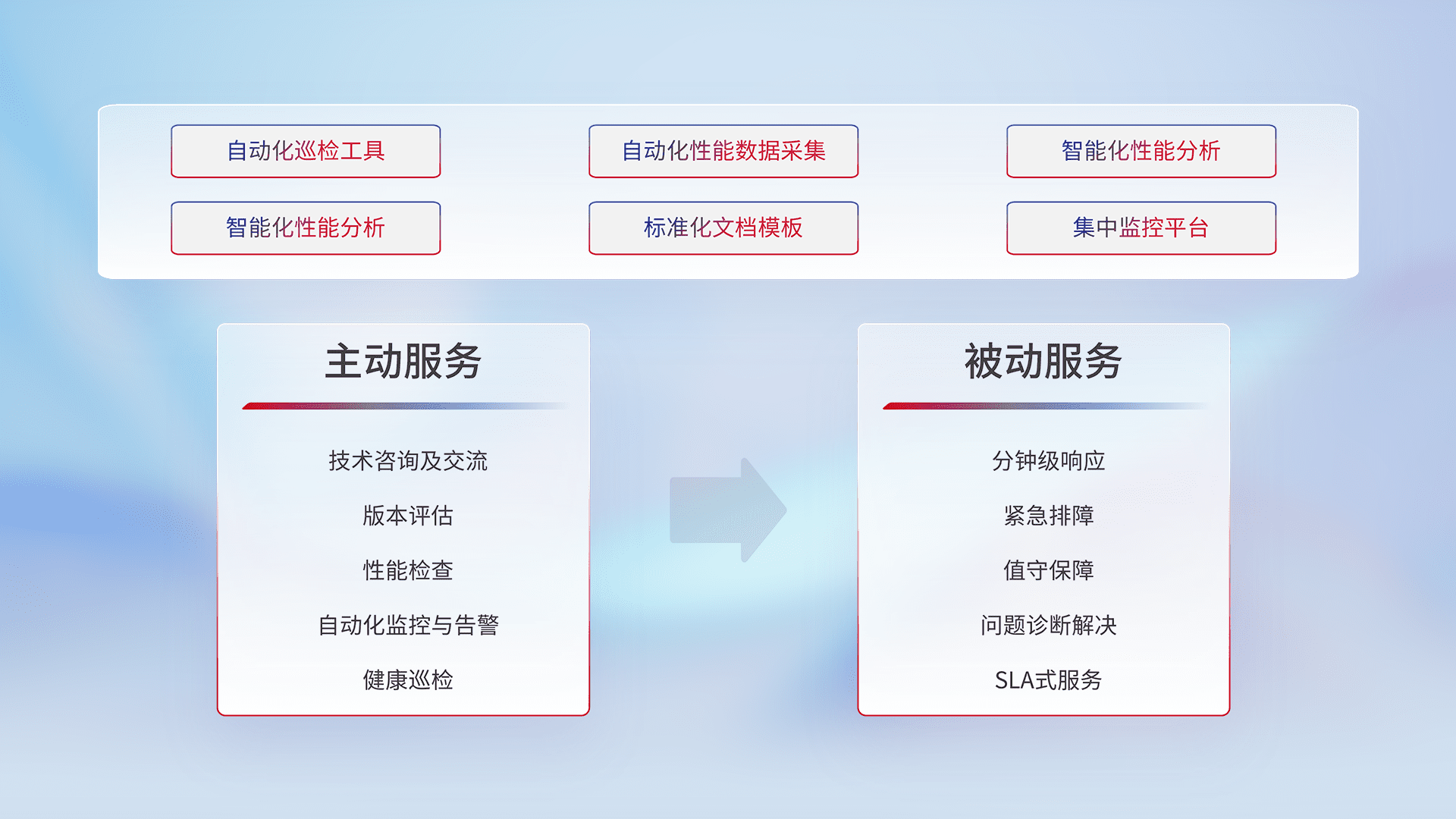 智能化工具和标准化文档,,,,保障服务质量,,提供主动服务(包含技术咨询、、、版本评估、、、、性能检查、、、、自动化监控与告警、、、健康巡检)和被动服务包含(分钟级响应、、紧急排障、、、、值守保障、、、、问题诊断解决、、、、SLA服务)。。
